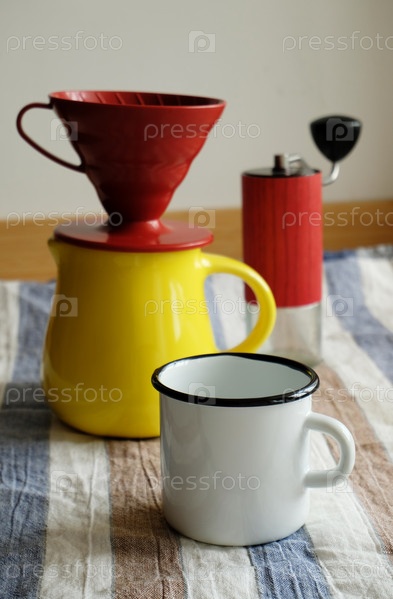 Белая эмалированная кружка, желтый керамический кувшин, красная капельница и кофемолка на льняной полосатой скатерти. Эстетика пасторального стиля