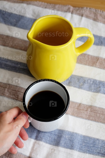 Черный кофе в белой эмалевой кружке в руке и желтый керамический кувшин на льняной полосатой скатерти