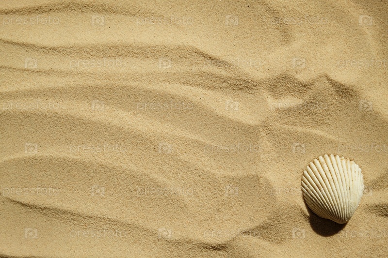 Ракушки на песчаном пляже. Летний фон. Путешествие в морские страны