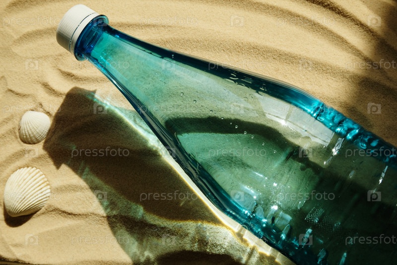 Голубая бутылка воды на песчаном пляже с ракушками. Лето, отпуск, курорт