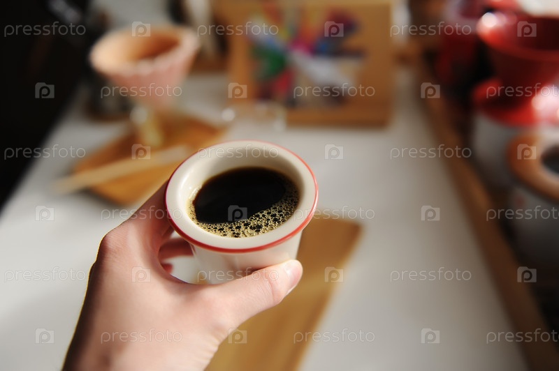 Черный кофе в чашке в руке крупным планом. Колесо вкуса и капельница оригами на заднем плане. Специализированная эстетика третьей волны