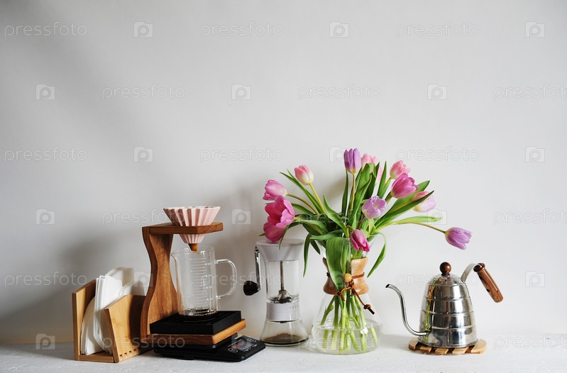 Букет тюльпанов цветов в графине кофе на белом столе. Ручное заваривание с помощью капельницы оригами, бумажный фильтр