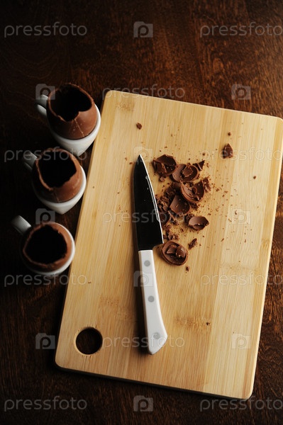 Пасхальный десерт, процесс приготовления. Шоколадные яйца вырезаны на деревянной доске. Вид сверху, нож. Темный фон