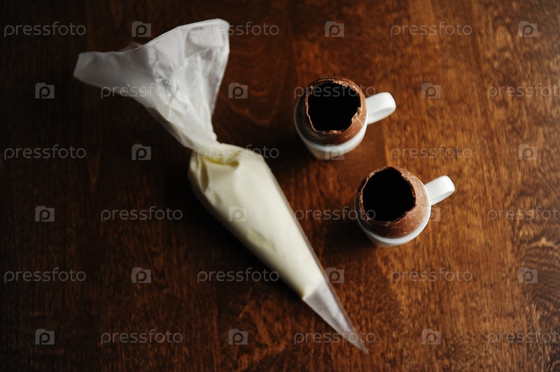 Пасхальный десерт, процесс приготовления. Открытые шоколадные яйца. Крем в кондитерском мешочке. Темный фон. Вид сверху