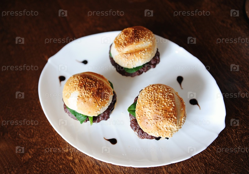 Три свежеприготовленных гамбургера на белой тарелке сверху. Булочка с кунжутом, котлета из говядины, зелень шпината и текучий ягодный соус