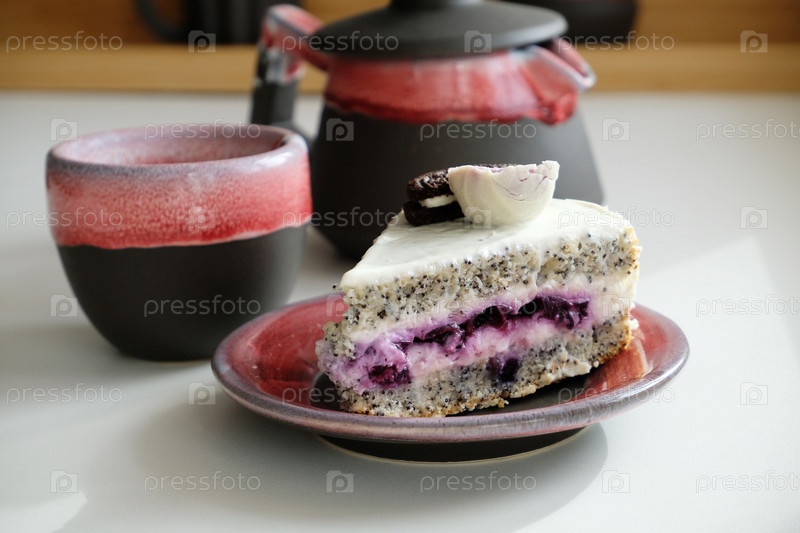 Кусочек пирога и кофе подаются в глиняной посуде ручной работы. Чашка, тарелка, налейте капельницу и горшок