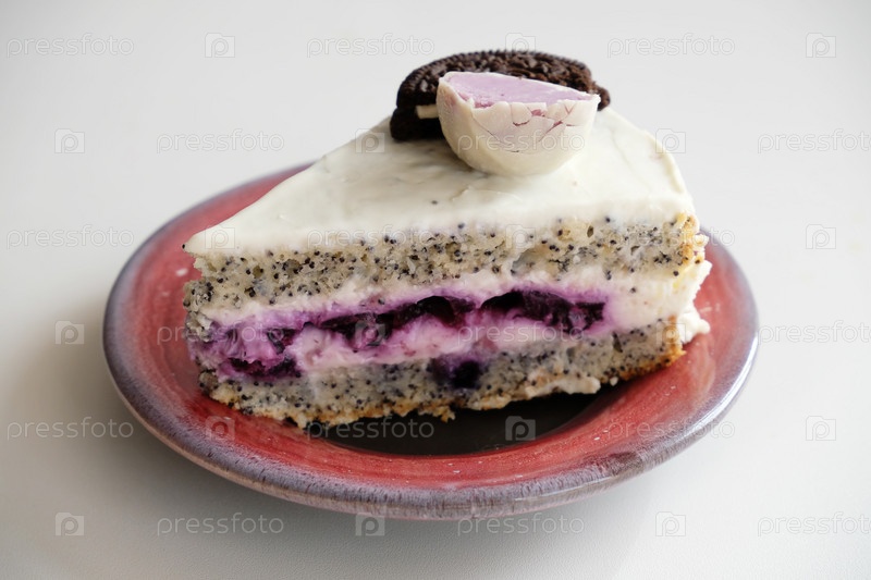 Кусок пирога на тарелке на белом фоне. С маком, черникой, белым шоколадом