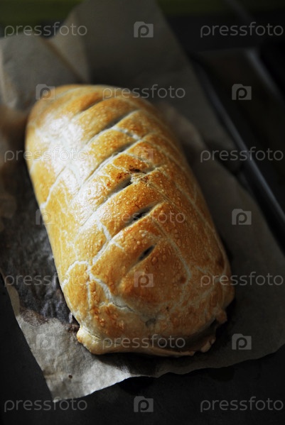 Свежеиспеченная говядина Веллингтон на пергаменте на противне