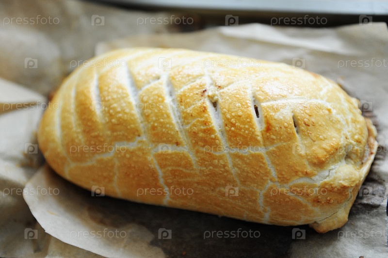 Свежеиспеченная горячая говядина Веллингтон на пергаменте на противне