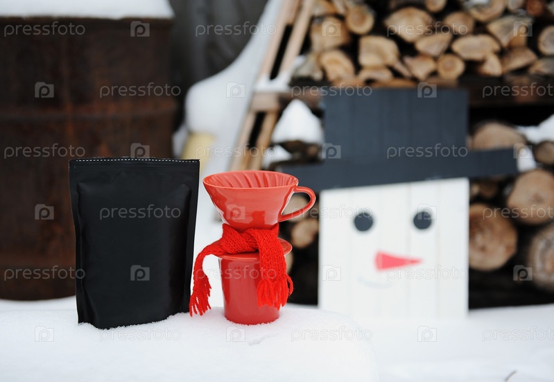 Кофейный пуровер украшен вязаным шарфом. Фон зимнего двора. Самодельный снеговик из деревянных досок возле поленницы
