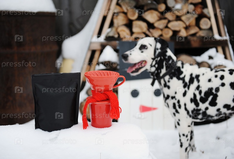 Далматинская собака на зимнем дворе. Заваривать кофе, украшенный шарфом. Самодельный деревянный снеговик возле поленницы