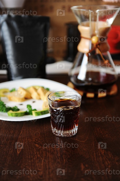Завтрак с кофе. Модный старомодный хрусталь. Японский омлет с авокадо и зеленью на белой тарелке. Ручное альтернативное заваривание