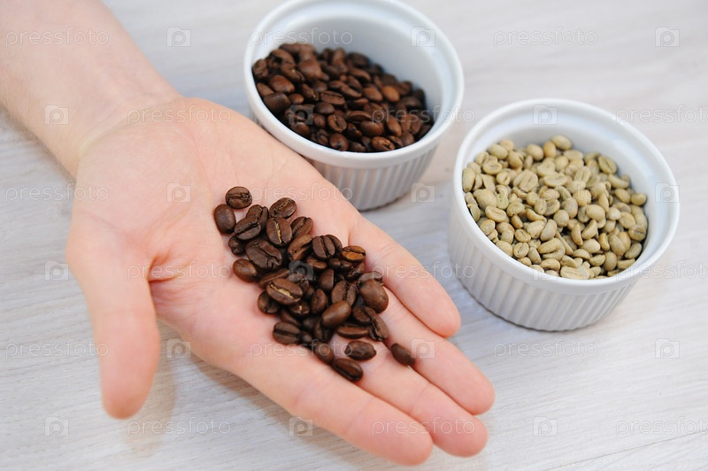 Жареный и зеленый необжаренный кофе в мисках. Свежеобжаренные кофейные зерна на ладони крупным планом