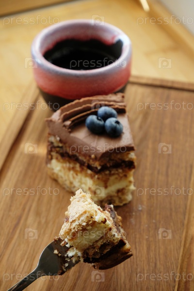 Кусок киевского торта с шоколадной глазурью и черникой и чашкой кофе на деревянной доске. Кусок пирога на вилке