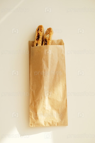 Кантуччи упаковывает печенье с цукатами и орехами в бумажный пакет. белый фон
