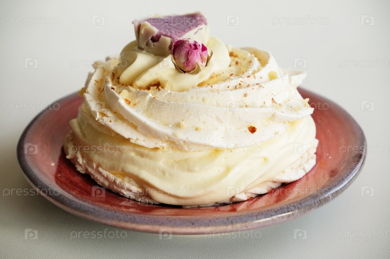 Десерт безе Павлова, украшенный цветком на фиолетово-красной керамической тарелке на белом фоне
