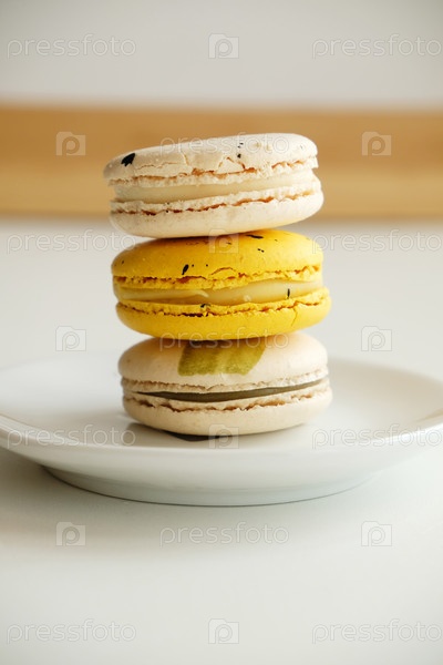 Миндальное печенье на белой тарелке. Десерт французской кухни, нежные цвета