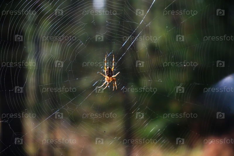 Коронованный садовый паук-кругопряд на паутине в естественной лесной среде обитания
