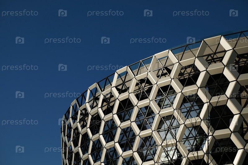 Казань, Россия - 04 15 2021: Фасад современного торгового центра. Стена состоит из шестиугольников сот. Современная архитектура