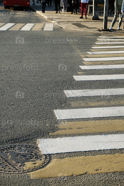 Пешеходный переход на городском перекрестке. Теплый сезон, солнечный день, пешеходный переход