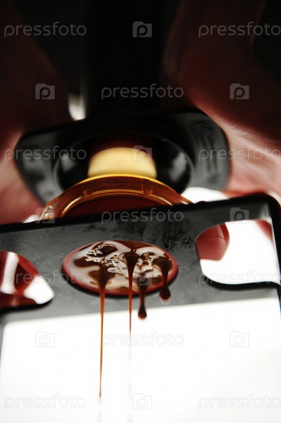 Эспрессо из ручной кофеварки, вид снизу, крупный план