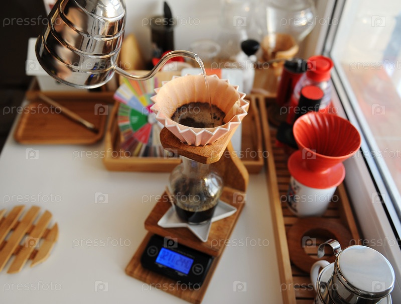 Розовая керамическая капельница оригами на деревянной капельной станции в масштабе. Натюрморт с ручным пивоварением