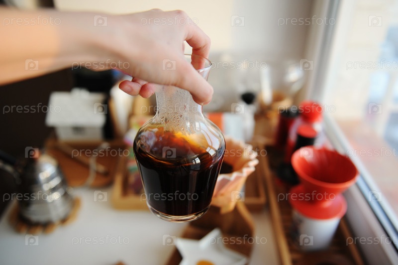 Фильтрованный кофе Balck проветривается в графине. Вихрь крупным планом. Натуральный образ ручной пивоварки