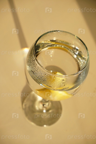 Горячая вода с долькой лимона в бокале на ножке. Солнечные лучи и блики на белой поверхности. Доброе утро