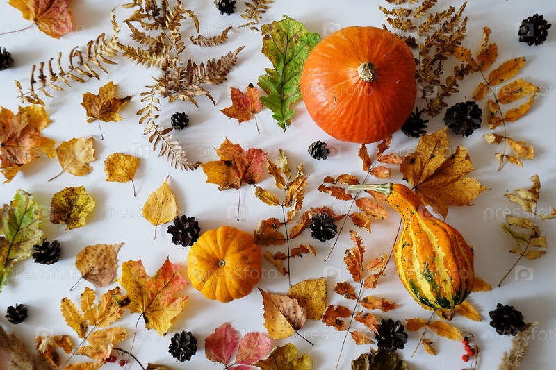 Элементы осеннего леса на белом фоне сверху: тыквы, листья и шишки. Макет, плоский