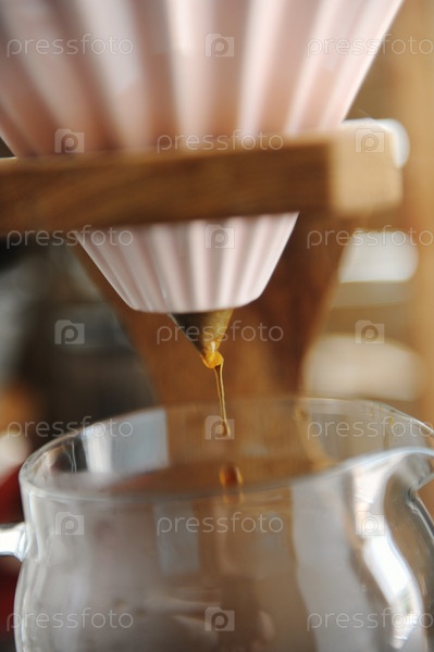 Кофе капает крупным планом. Альтернативное заваривание в розовой керамической капельнице оригами на деревянной подставке