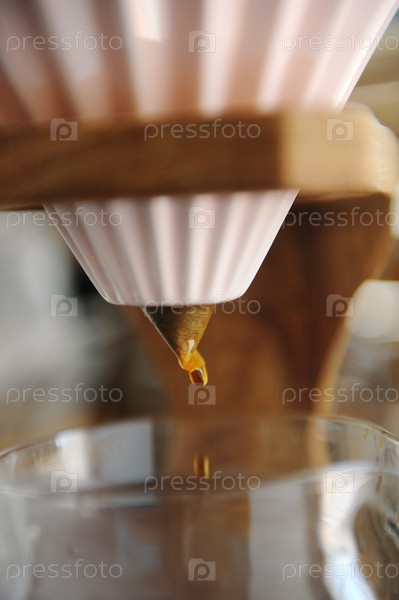 Кофе капает крупным планом. Альтернативное заваривание в розовой керамической капельнице оригами на деревянной подставке