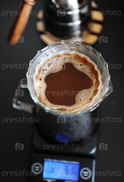 Альтернативное варение кофе. налейте прозрачное стекло в капельницу v60 с бумажным фильтром. электронные весы. вид сверху