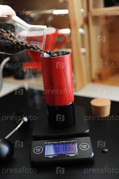 Красная ручная кофемолка на электронных весах с таймером. Альтернативная концепция пивоварения и спешиалти