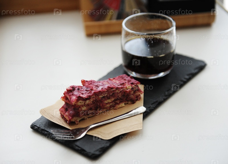 Подается черный кофе и десерт. Грифельная доска, веганский торт Наполеон Мильфей на бумажном кофейном фильтре