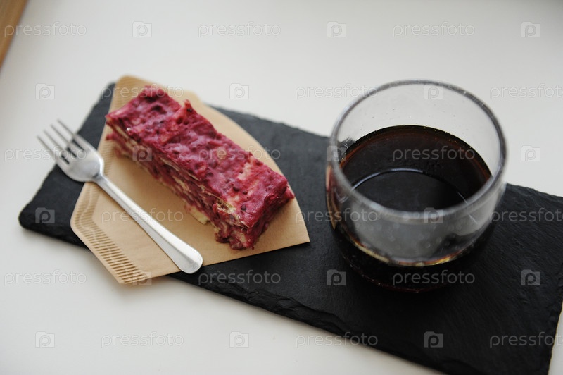 Подается черный кофе и десерт. Грифельная доска, веганский торт Наполеон Мильфей на бумажном кофейном фильтре