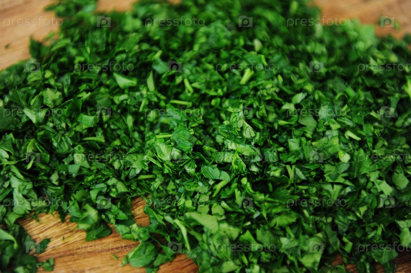 Нарезанная свежая сочная петрушка на крупном плане деревянной разделочной доски. Натуральные витамины, фон