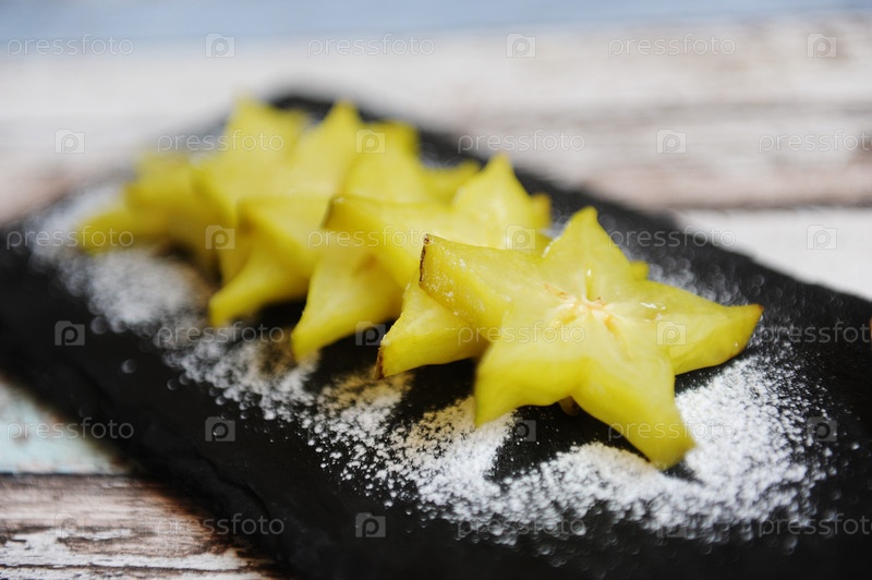 Кусочки карамболы подаются с сахарной пудрой на черной грифельной тарелке