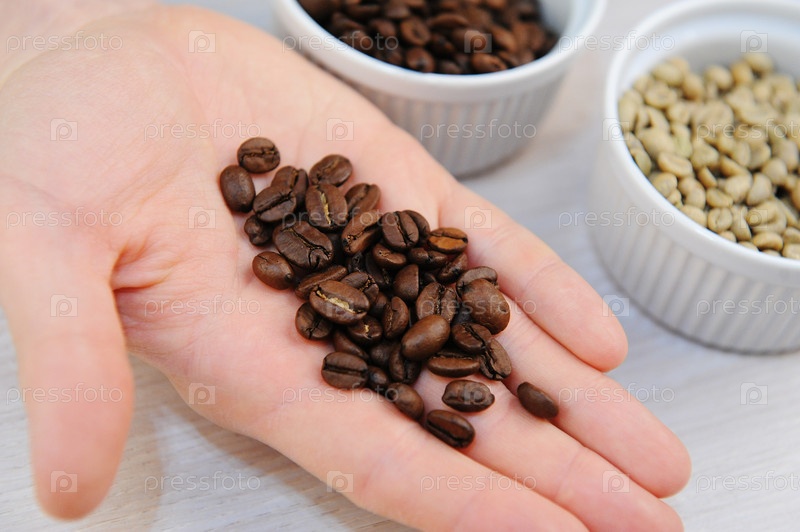 Жареный и зеленый необжаренный кофе в мисках. Свежеобжаренные кофейные зерна на ладони крупным планом