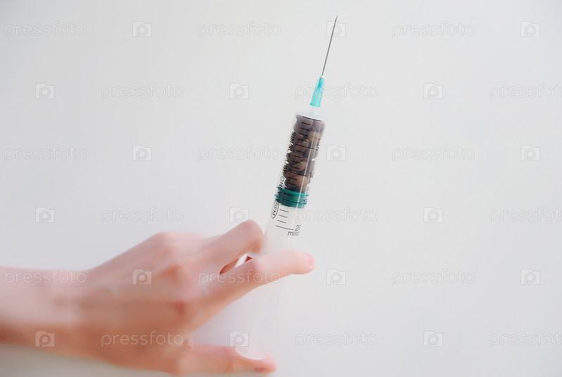 Кофейные зерна в медицинском шприце в руке. Символ зависимости от кофеина. Концепция медицины и здравоохранения