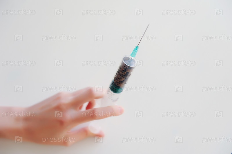 Кофейные зерна в медицинском шприце в руке. Символ зависимости от кофеина. Концепция медицины и здравоохранения