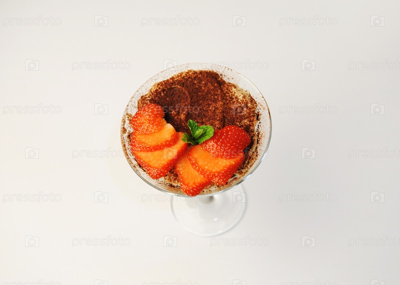Десерт тирамису в бокале для мартини. Украшен ломтиками клубники и мятой. Вид сверху. Белый фон, изолированные