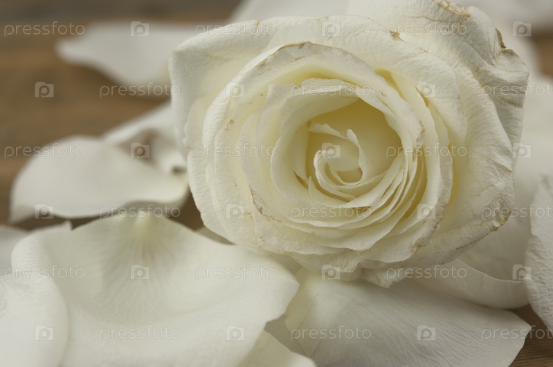 Букет белых свадебных роз на фоне дерева с цветочными лепестками