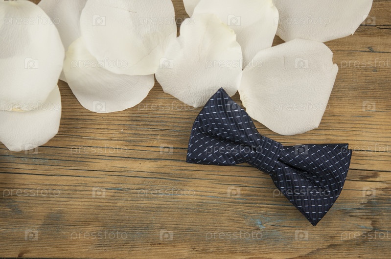 Лепестки белых роз с галстуком-бантом на темном деревянном столе. Романтическое свидание. День рождения. Свадьба. Праздничный день. Скопируйте пространство. Вид сверху