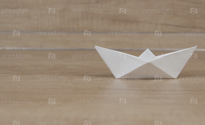 Оригами парусник, деревянный фон. символические для бизнеса, концептуальные и