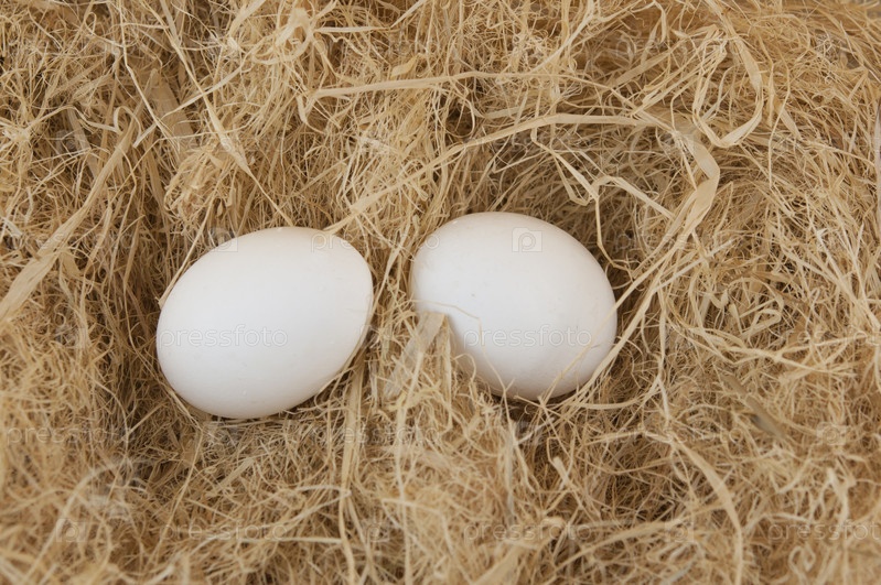 Белые яйца, положенные на кучу соломы. В яйцах содержатся витамины, фосфор, цинк