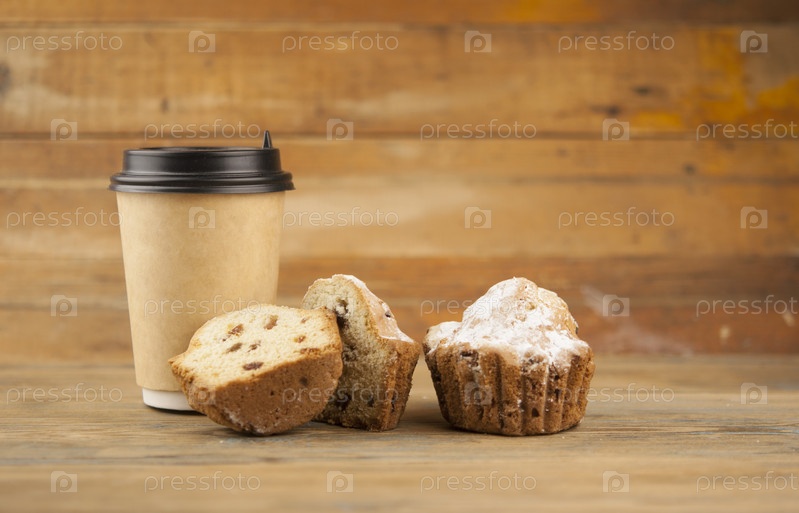 Домашние ванильные кексы с бумажной одноразовой кофейной чашкой на деревянном столе