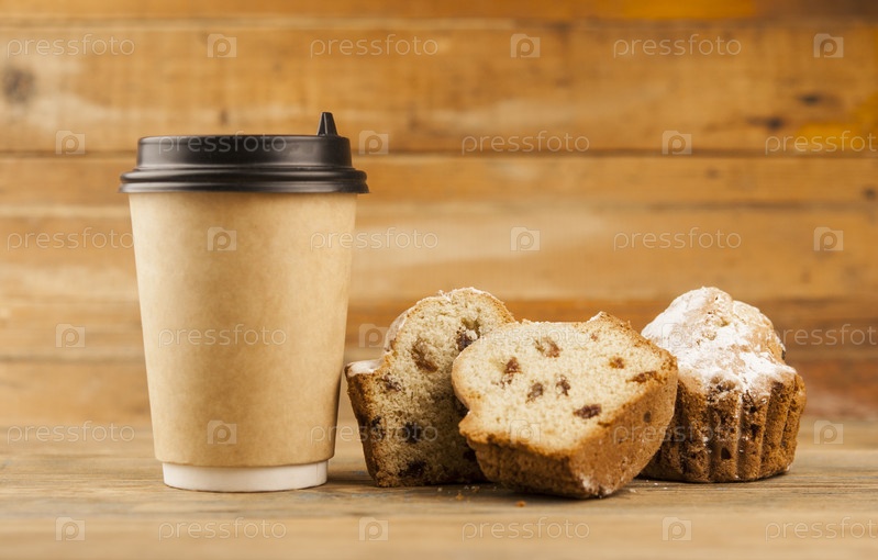 Домашние ванильные кексы с бумажной одноразовой кофейной чашкой на деревянном столе