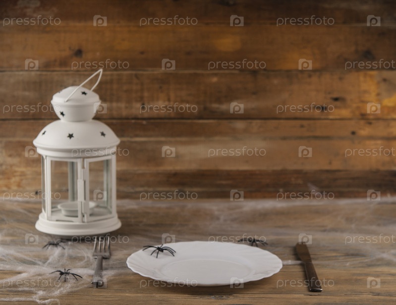Хэллоуинский стол сервирует пустое блюдо, нож и вилку с паутиной на деревянном фоне. Модная концепция праздника