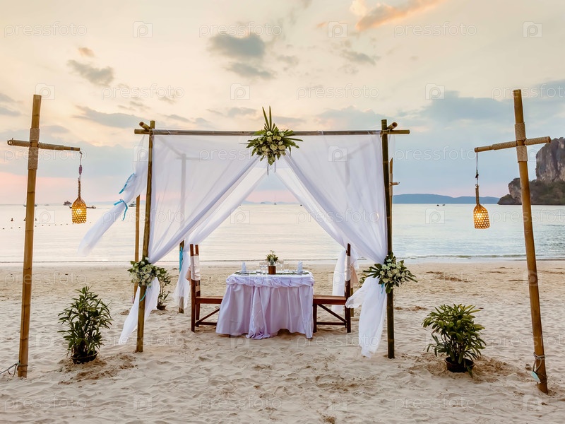 Закат и романтический роскошный ужин на тропическом пляже. Украшенный стол бокалами для вина. Белые и пурпурные тона