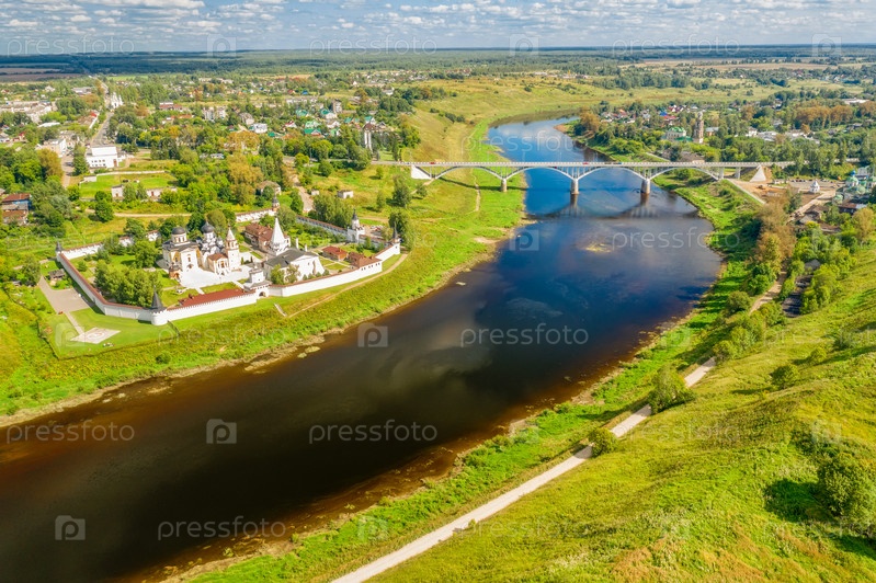 Вид с высоты на город Старицу и Свято-Успенский монастырь на берегу Волги